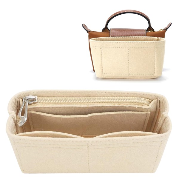 vesaneae Small Bag Insert Organizer, 16x8x5cm Felt Bag Organizer Insert with Zipper for Longcham, Beige Multi-Pocket Small Handbags Organiser Inner for Women's Tote Bag