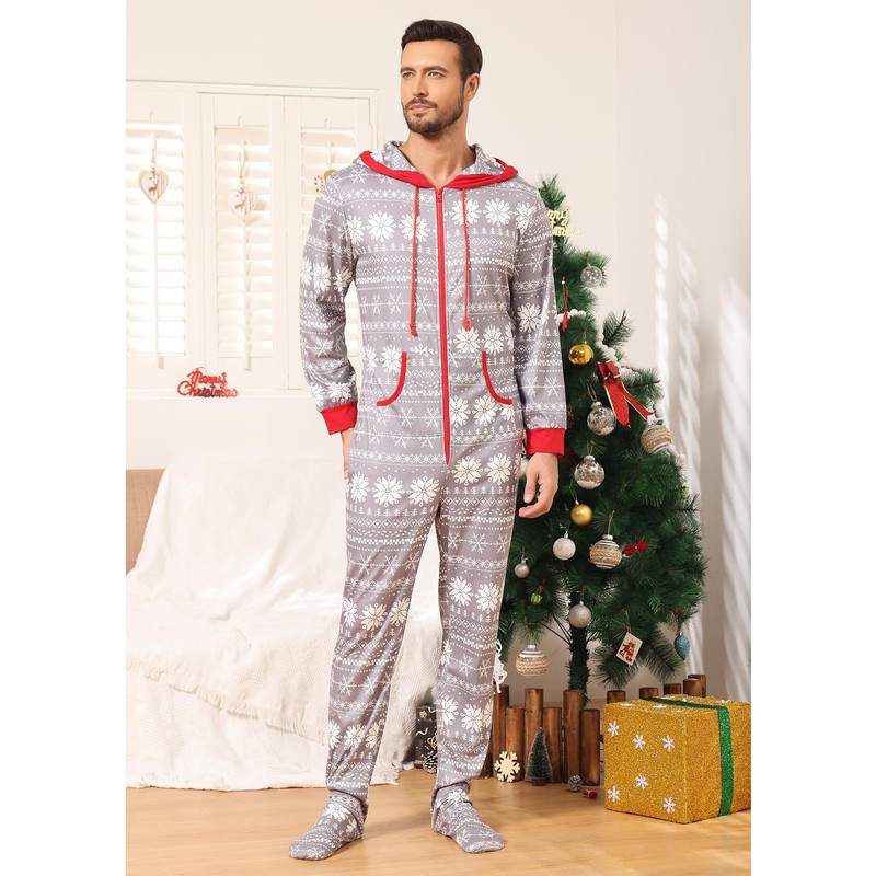 Veseacky Family Christmas Pajamas Matching Sets Onesie Zipper Hooded Footed One-Piece Pjs Jumpsuits for Men (Grey, XXL)
