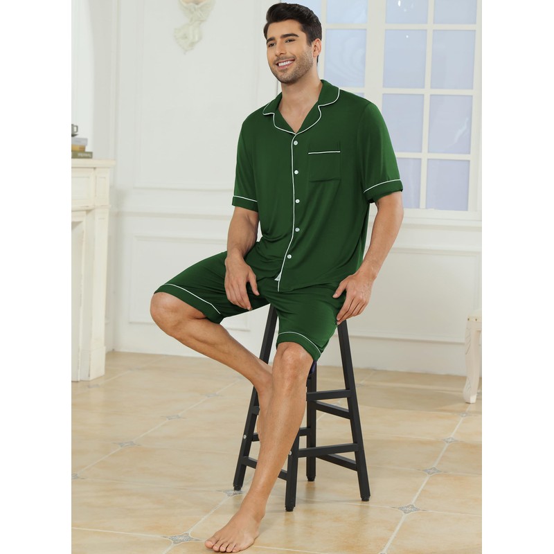 - 【FEATURES】 Mens pajamas set with short sleeve button-down tops and elastic waist shorts, easy to put on and off. Mens pjs sets with classic notch collar, left chest pocket. Mens loungewear sets with pockets to place your phone and wallet.