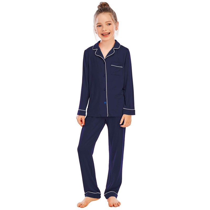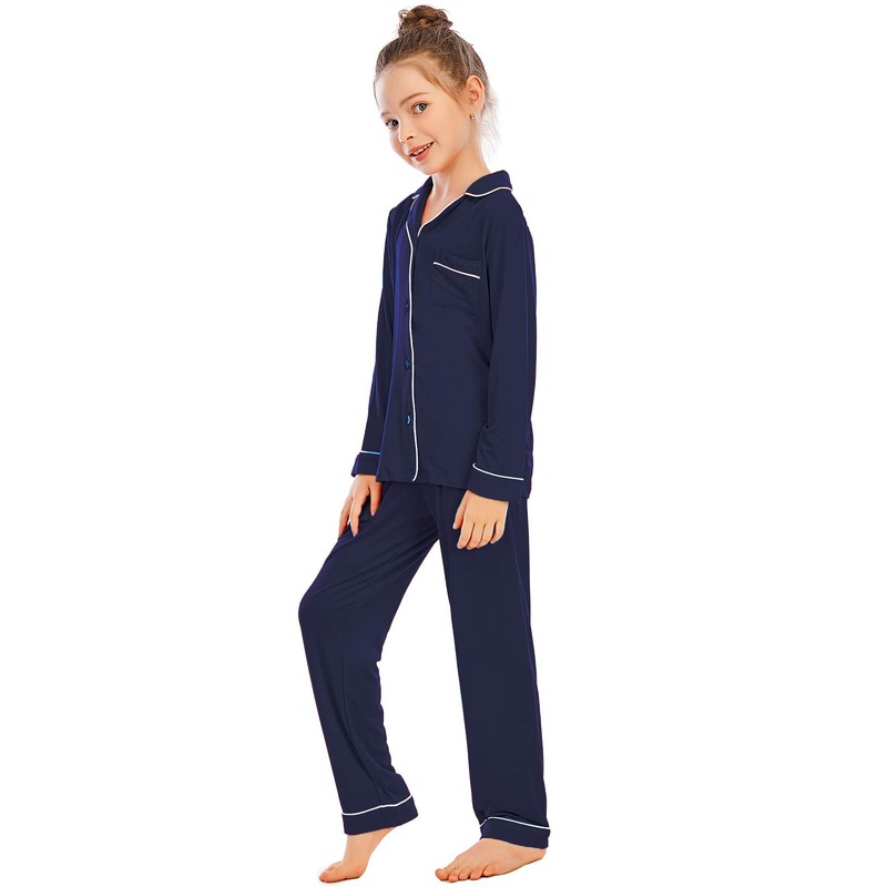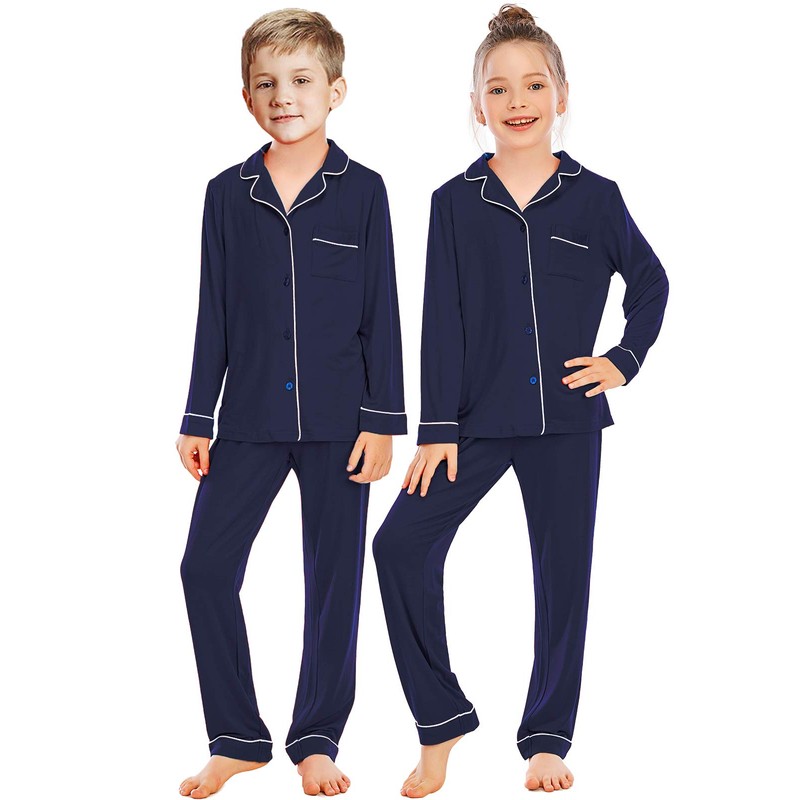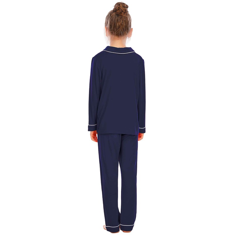 Veseacky Unisex Girls Boys Long Sleeve Sleepwear Button Down 2 Piece Pajama Set for 5-14 Years, navy