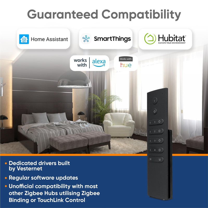 - BUTTON CONTROLLER: 12 buttons that work as a "Button Controller" in supported Smart Home Hubs such as Hubitat, SmartThings & Home Assistant. With pushed, held & released events for each of the Group buttons and a scene event for each of the Scene buttons, it means you'll have 26 unique events to trigger Scenes and logic in your Hub.