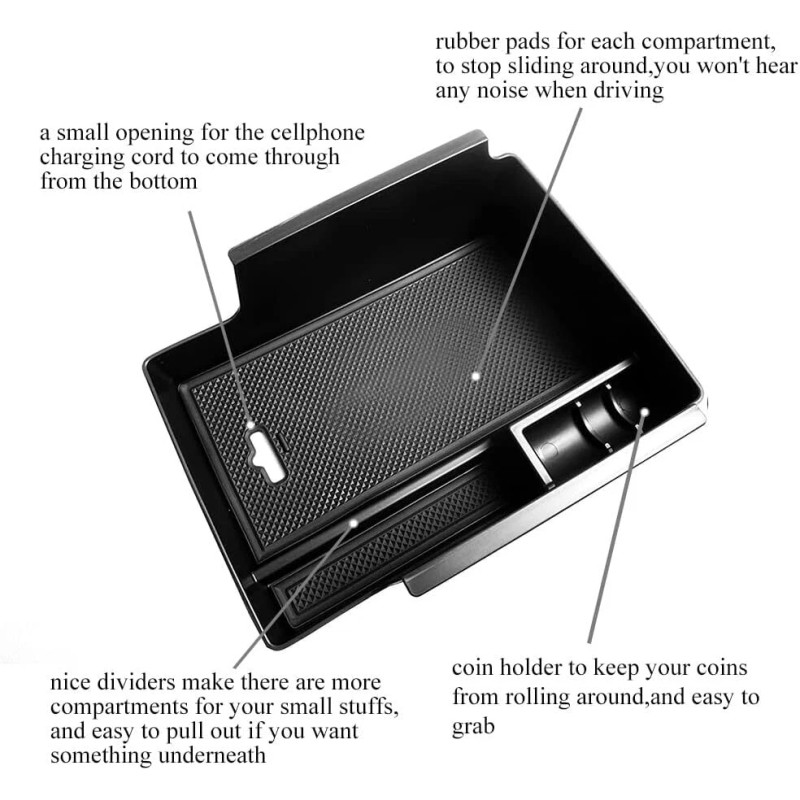 - Special Design:Attached anti-skid rubber pads to prevent items from rattling and sliding when driving;A hole on the tray for charging cables to pass through