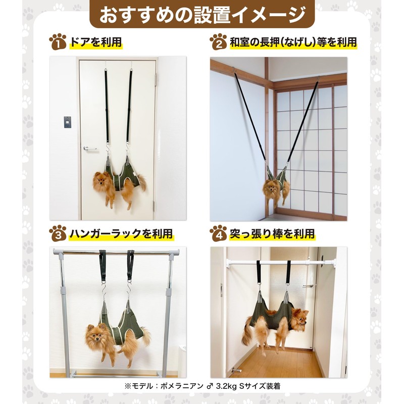 • With a dedicated door hook and long extension belt, you can easily and safely create a "home care environment" in any home. The long extension belt can be extended up to 3.3 ft (1 m), so even if you hang it from a high position such as a duck door near the ceiling, you can place your pet in a lower position even in case of a fall. We also recommend using a hanger rack or tension rod in your home