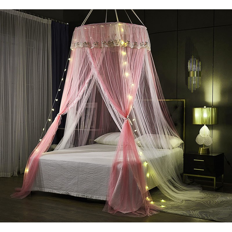 VETHIN Princess Bed Canopy for Girls Double Layer Sheer Mesh Dome Elegant Embroidery Lace Mosquito Net Bed Curtain for Full Queen King Bed with led Stars String Lights(Pink/White-1)