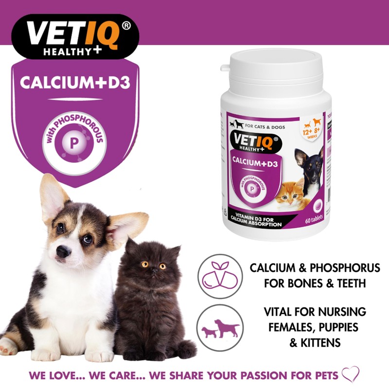 - VETIQ CALCIUM + D3 TABLETS: These tablets combine both calcium and phosphorus which is particularly beneficial for puppies, kittens and nursing mothers when calcium demand is high