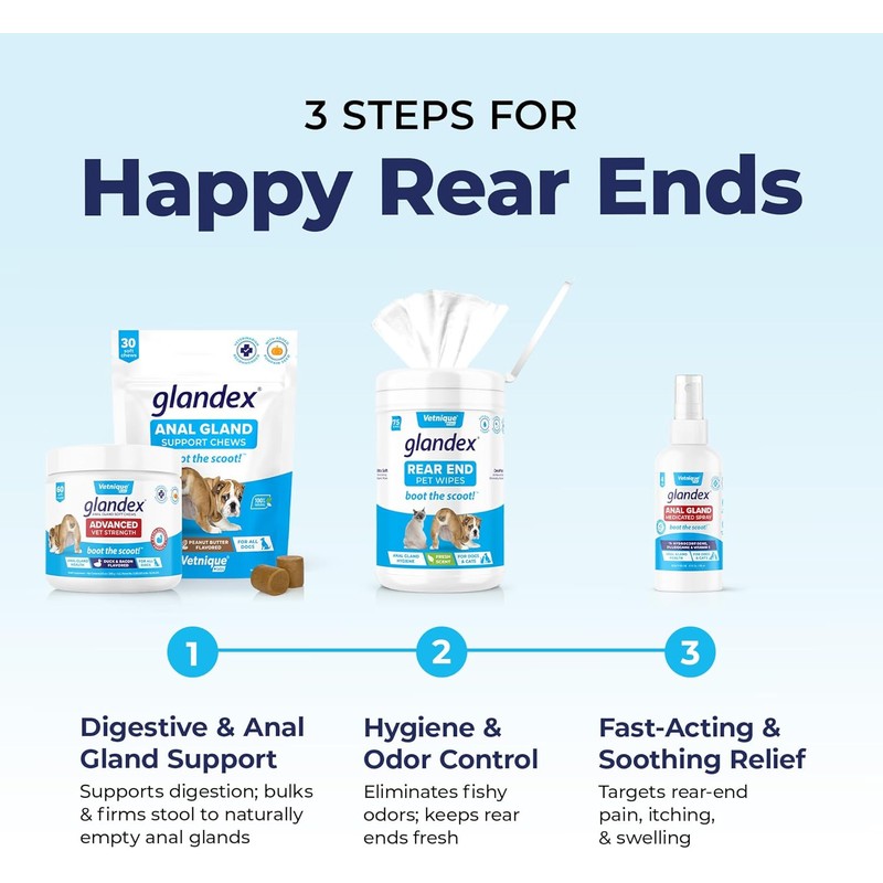 - SUPPORTS HEALTHY ANAL GLANDS: Glandex is proven to support healthy anal glands in all size dogs and is the only product to target all of the underlying causes of anal gland problems. Glandex helps to bulk and firm dog stools.