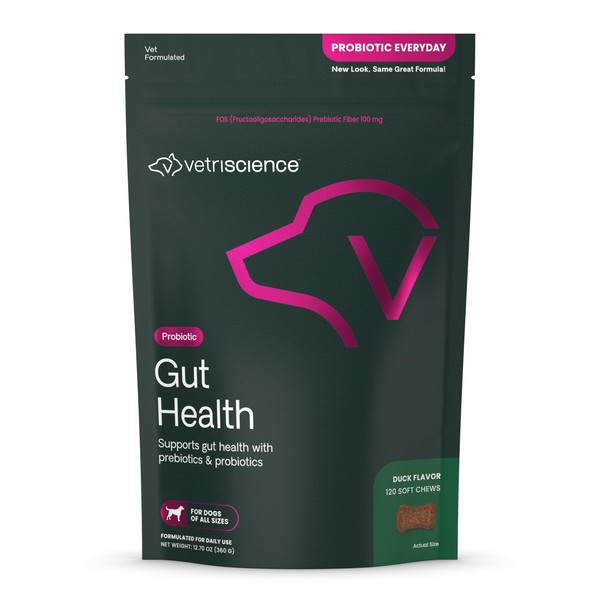 Support your dog's digestive health and overall well-being with VetriScience Gut Health (new name, same great Probiotic Everyday formula). These tasty dog probiotic chews are formulated to provide essential gut support at every life stage. Each chew contains 1 billion CFU of Bacillus coagulans, a highly stable and effective probiotic, along with prebiotic fiber to help balance gut bacteria and promote a healthy digestive system. These probiotics for dogs are ideal for supporting regularity, improving stool quality, and soothing occasional diarrhea or gastrointestinal upset. Whether your dog is a playful puppy adjusting to new diets, an active adult in need of digestive support, or a senior requiring an extra boost of good bacteria, this daily probiotic is a simple solution suitable for all breeds and sizes. The addition of prebiotics like fructooligosaccharides (FOS) helps nurture beneficial bacteria growth while acting as a gentle fiber to support digestion and maintain regularity. These delicious, duck-flavored chews make it easy to supplement commercial or homemade diets, ensuring your dog gets the gut health support they deserve. Incorporate these chews into your dog's routine to promote immune health, enhance recovery from illness or injury, and keep their stomach happy and balanced every day. Our dog and cat supplements are certified by the National Animal Supplement Council (NASC), routinely undergo third-party testing, and contain no hidden ingredients, artificial flavors, synthetic colors or preservatives.