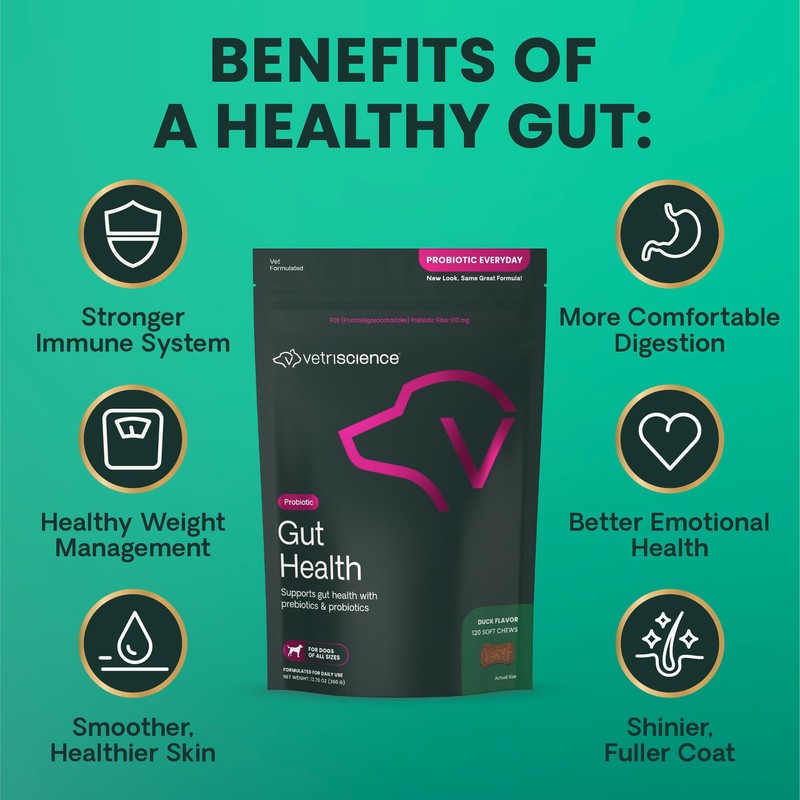 VetriScience Gut Health Chews, Probiotic Everyday Digestive Supplement for Dogs, Digestion Support, Gas & Diarrhea, Immune Support, 1 Billion CFU Per Chew, Duck, 120 Count