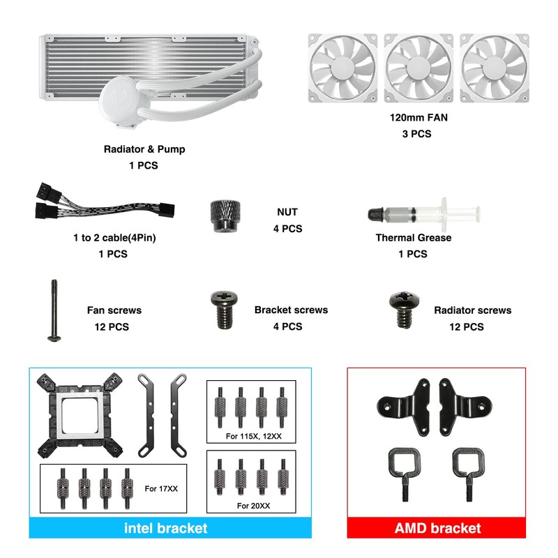 - Better Cooling Performance: With a more efficient cold plate, spraying copper bottom, proprietary pump and fans optimized for static pressure to make sure the excellent heat transfer from cpu.