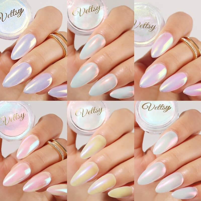 Vettsy Mermaid Ice Transparent Aurora Chrome Nail Powder, 6 Colors Transparent Iridescent Shimmer Pigment Pearlescent Nail Art Glitters