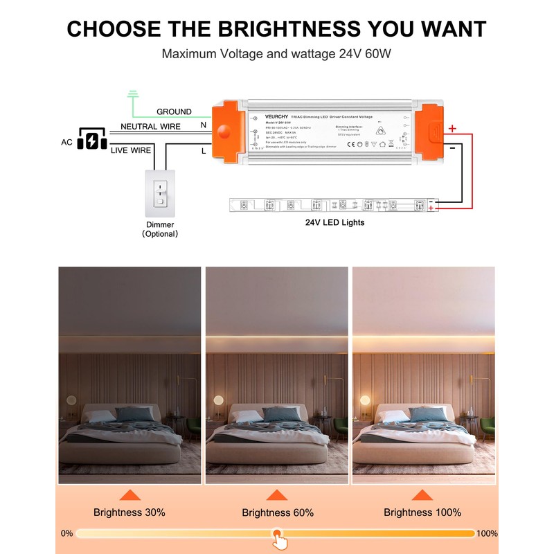 - 3-Year Waranty: VEURCHY 60 watt led driver 24 volt is committed to ensuring the quality of 24v dimmable transformer, and we offer a 3-year waranty. If you encounter any issues with installation, troubleshooting, or product functionality, our team is prepared to provide timely support within 24 hours