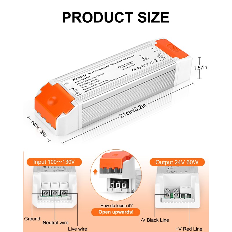 - Easy to Install: This LED transformer 24v dimmable 60w is an ideal choice for DIY enthusiasts and professionals. Input and output with orange isolation, waterproof and dustproof protection. Tips: The original design intention of the orange isolation protective cover was to achieve dust prevention and secure wires, improving safety and service life. So the lid is a bit tight and needs to be pried open with a hard object. Please be careful when opening