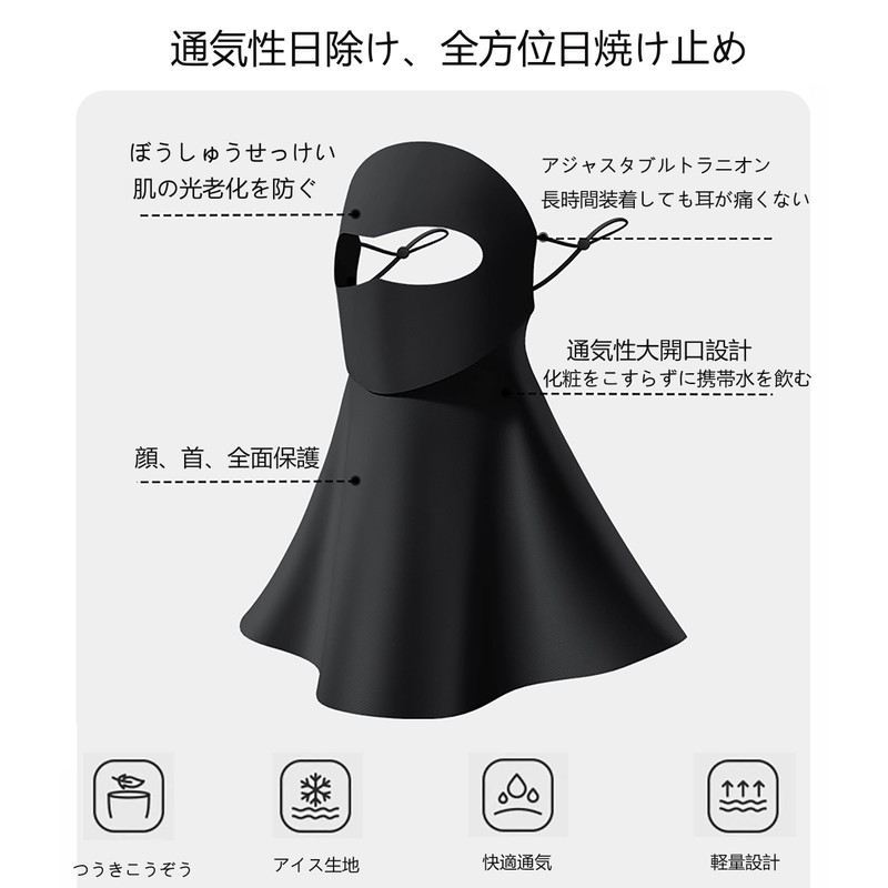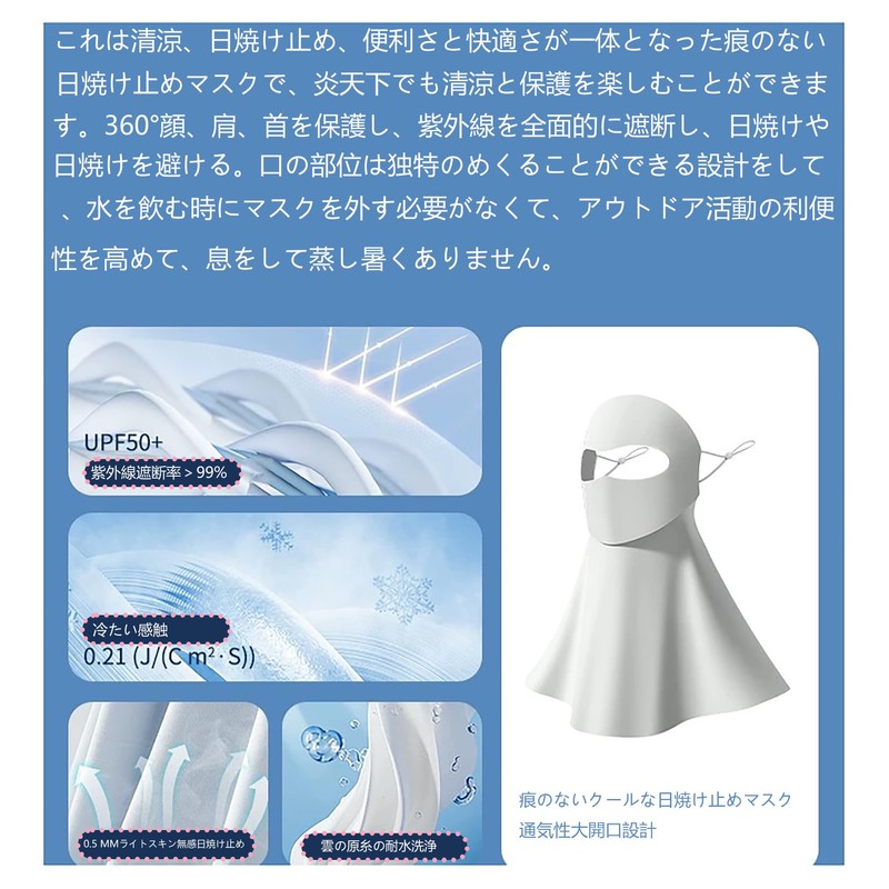 - 【全面UVカットUPF 50+】強い日光保護機能を持ち、顔の老化した紫外線から肌を保護する。アウトドアでも日焼けの心配が軽減されます。
