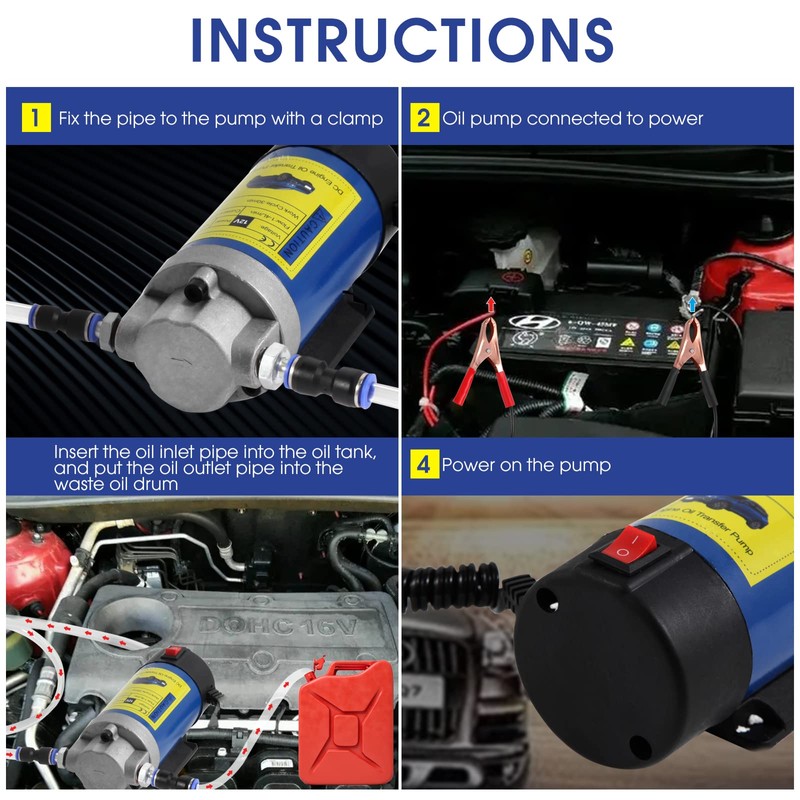 • 【EASY TO USE】 Oil fluid extractor is easy to install, easy to use, small in size, light and portable, easy to store and carry to any place you want. No special tools required, needn't warm engine oil up. Just fix the two clips on the battery power supply, connect 2 inlet hoses(6mm,8mm) by adapter, fix outlet hose(10mm) on the outlet by yellow clamp, and turn the power on.