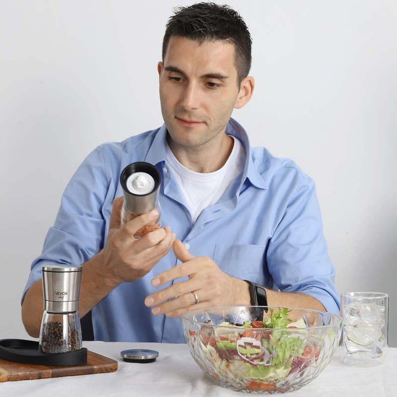 VEVOK CHEF Salt and Pepper Grinder Set Adjustable Coarseness Ceramic Pepper Mill Salt Crusher with Silicone Tray Salt and Pepper Shaker Spice Grinder Kitchen Chef Gift