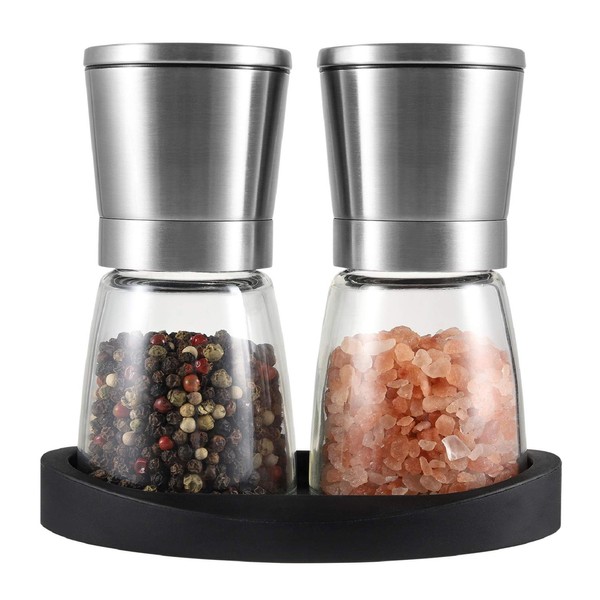 - HIGH QUALITY SALT AND PEPPER GRINDERS-The pepper grinder is made of stainless steel and glass. The rubber base will protect the glass grinder. Stainless steel grinder's cap, rubber base which make the mill set more convenient for kitchen-to-table use.