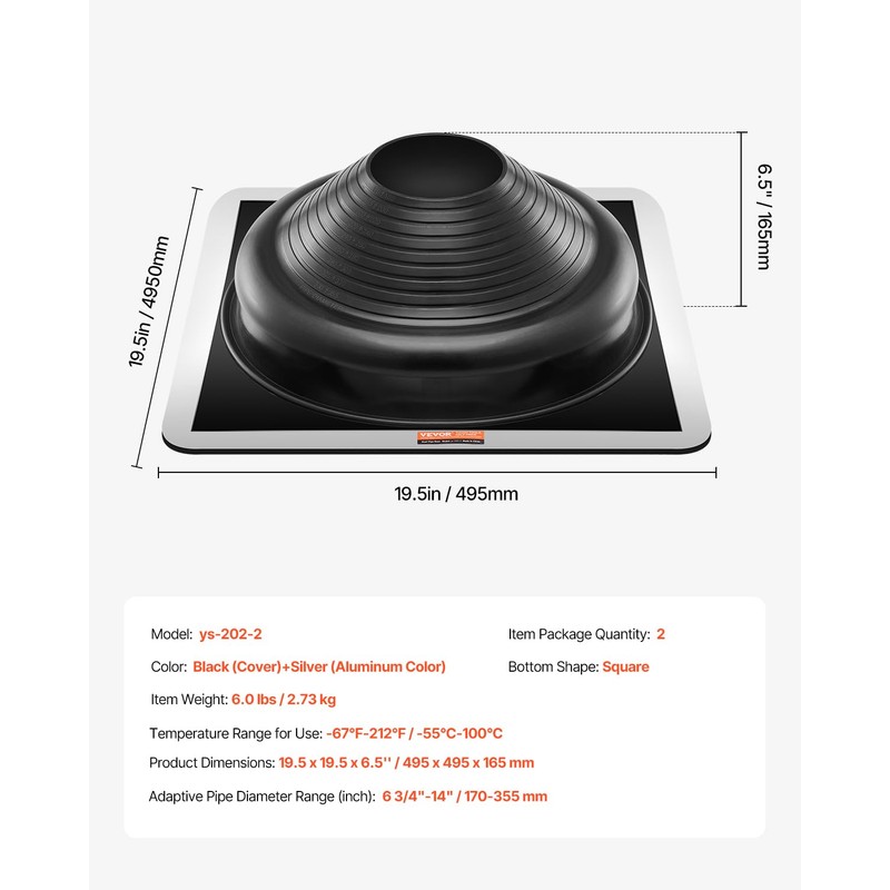 - Flexible Design, Handles Various Sized-pipes: This roof pipe flashing kit includes 2 black EPDM square-based boots, each measuring 19.5'' x 19.5'' x 6.5''. Suitable for pipe diameters ranging from 6-3/4" to 14", they can be effortlessly cut to the size you need!
