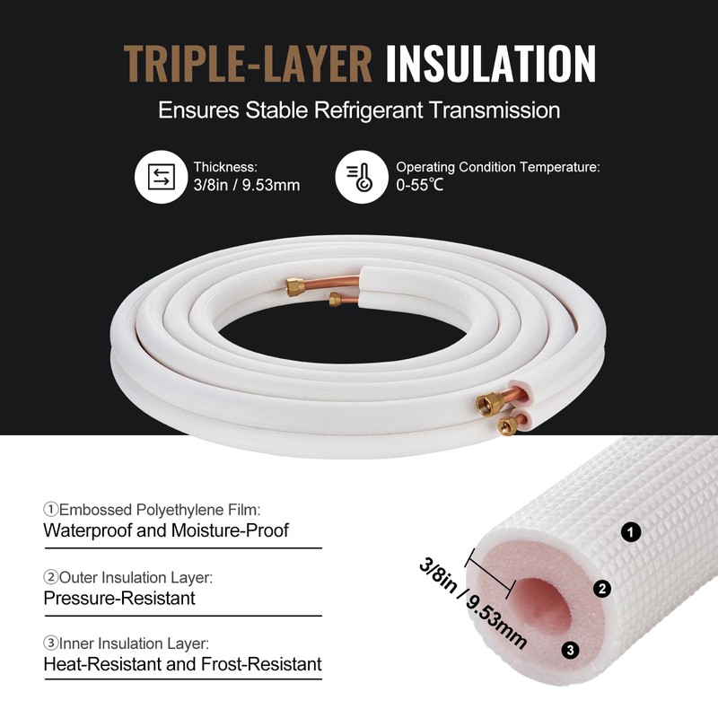 VEVOR 25FT Mini Split Line Set, 1/4" & 1/2" O.D Copper Pipes Tubing and Triple-Layer Insulation, for Mini Split Air Conditioning Refrigerant or Heating Pump Equipment & HVAC with Wrapping Strips.