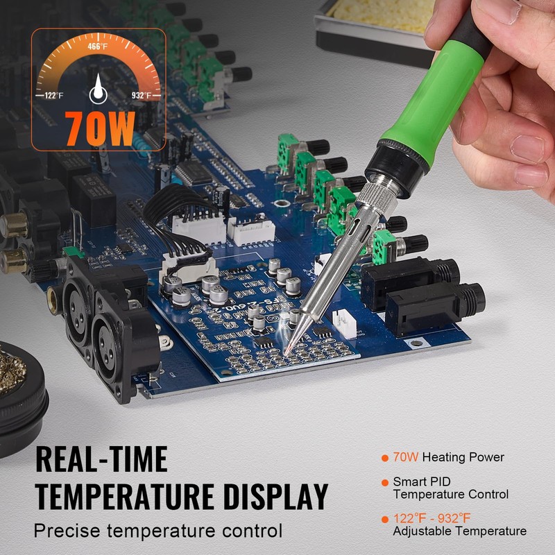 Smart temperature control for faster, more precise heating! With 70W high power, PID temperature control and 122℉-932℉ adjustable temperature, this soldering iron station ensures efficient soldering, ideal for circuit board repair, jewelry repair, DIY projects, etc.