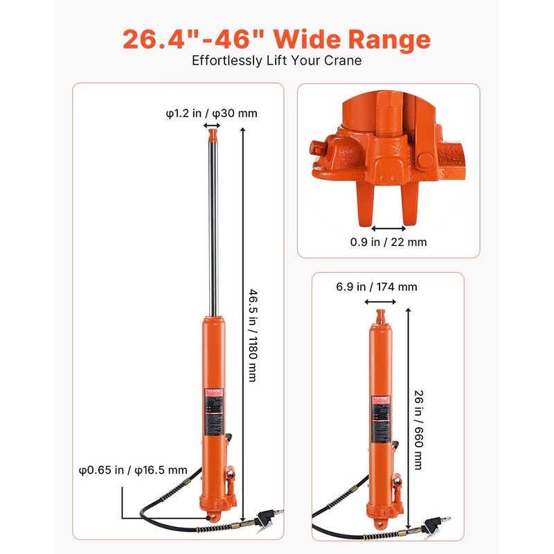 - 8T Capacity & Adjustable Lifting Range: This hydraulic jack makes lifting heavy loads a breeze, with an impressive 8-ton capacity. It has a flexible lifting range of 26-46.5 in (660-1180 mm), fitting most cranes.