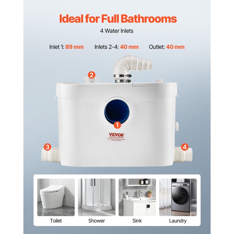 VEVOR 900W Macerator Pump, 48 GPM Flow, 40 ft/12 m Head, Macerator Sewerage Toilet Pump with 4 Water Inlets, Waste Water Disposal Upflush Machine for Toilet, Basement, Shower, Sink, Laundry, Bathtub
