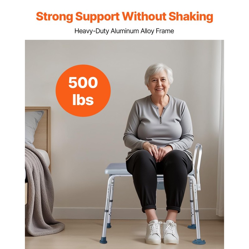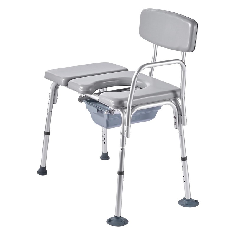 - 4-in-1 Toilet Commode: This chair combines a bedside commode and tub transfer bench in one. Built with a reinforced aluminum alloy frame, it supports up to 500 lbs. Use it as a bedside commode, tub transfer bench, raised toilet seat, or shower chair