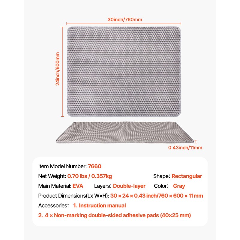 VEVOR Cat Litter Mat, 30 x 24 in, Double-Layer Litter Box Mat, Non-Slip & Urine-Proof Litter-Trapping Mats for Indoor Cats, Honeycomb Design, Soft on Paws, Washable Large Kitty Mats for Floor