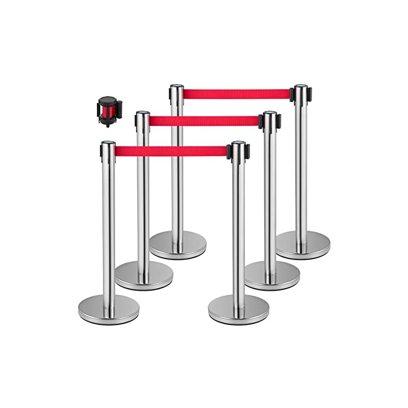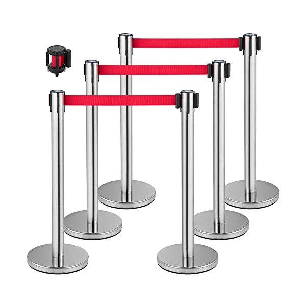 VEVOR Crowd Control Stanchion, Set of 6 Pieces Stanchion Set, Stanchion Set w/ 6.6 ft/2 m Red Retractable Belt, Crowd Control Barrier w/Rubber Base – Easy Connect Assembly for Crowd Control (Silver)