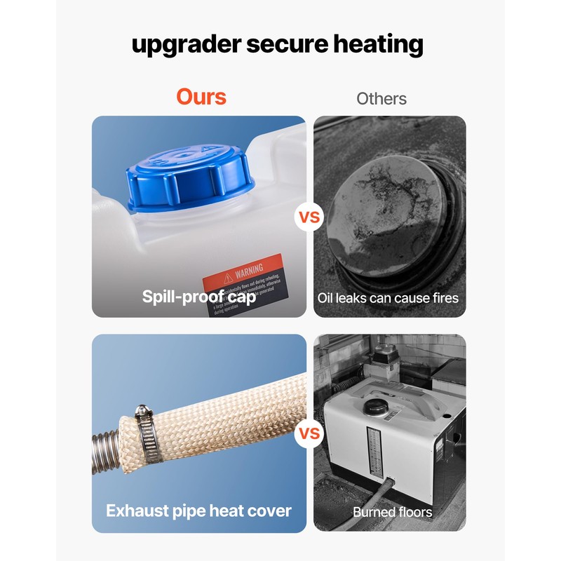 - Security Features: This diesel air heater features exhaust pipe heat sleeve to reduce floor damage risks. The sealed fuel cap ensures secure long-term use. Built-in protections include overheat shutoff (≥536℉), reverse polarity, and overvoltage