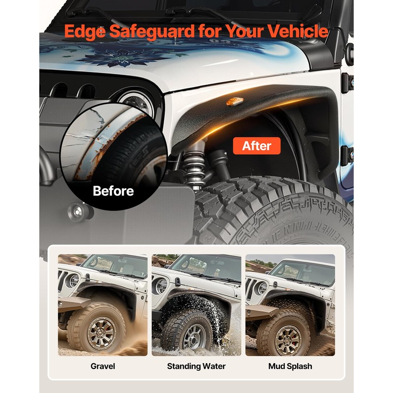 - Bold New Look: Give your Jeep a standout look with VEVOR front & rear fender flare kit. The aggressive, wide design enhances your vehicle's rugged charm and is ideal for off-road adventures. With paintable panels, you can easily add your own style to the flares and make your Jeep even more unique