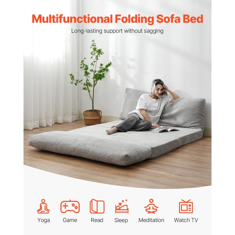 VEVOR Folding Sofa Bed, 3-in-1 Foldable Couch Bed with Washable Cover, 25D High Density Memory Foam Convertible Sleeper Chair Bed, Futon Couch for Living Room, Bedroom, Guest, Light Grey(Full)