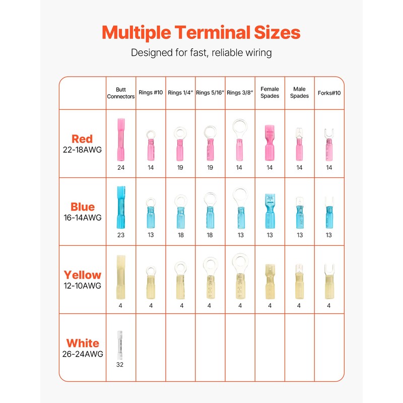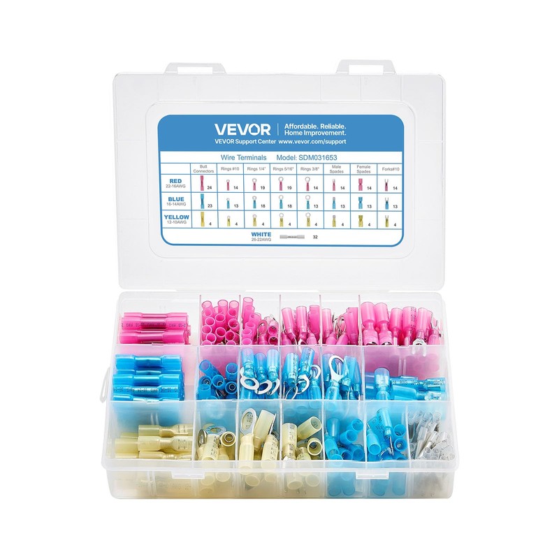 VEVOR Heat Shrink Wire Connectors, 320PCS, Electrical Waterproof Crimp Connectors Terminals Kit, Insulated Butt Ring Fork Spade Splices, 26–22 22–16 16–14 12–10 Gauge, for Industrial Marine Automotive