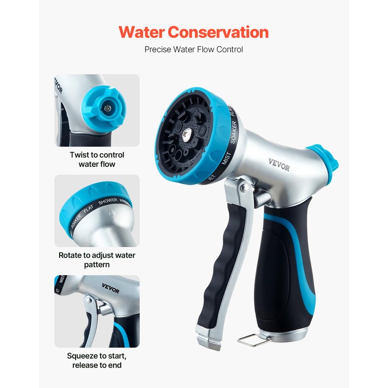 VEVOR Hose Nozzle, 10 Adjustable Spray Patterns, Metal Water Nozzle with Comfortable Ergonomic Grip, Garden Nozzle Sprayer with Flow Control for Watering Plants & Lawns, Washing Cars & Pets