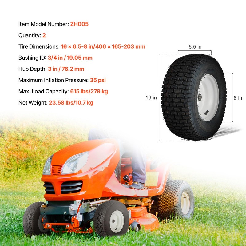 - Ideal Fit for Most Lawn Equipment: Size: 16" diameter, 6.5" width, 8" hub diameter – designed to fit most lawn mowers and lawn tractors. Make sure to check your machine's tire size before purchasing for the best fit.