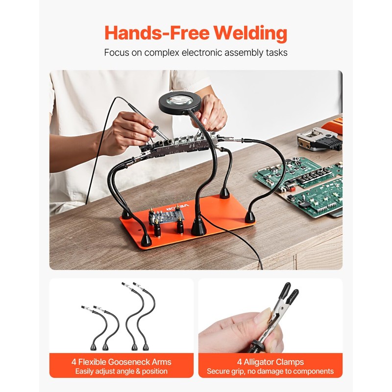 VEVOR Magnetic Helping Hands Soldering Station, 4 Flexible Arms Third Hand Soldering Tool, with 3X LED Magnifying Lamp, 4 PCB Pillar Holder & Heavy-Duty Base, Electronic Repair Craft Hobby DIY