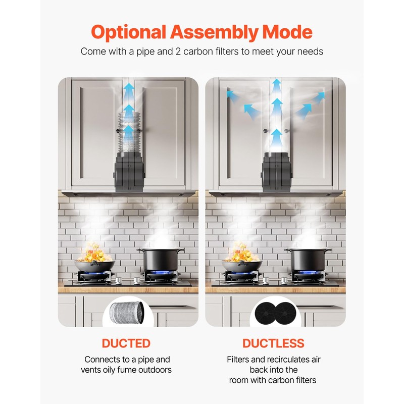 - Ducted/Ductless Convertible: Adapt the range vent hood to your kitchen setup with ease. It comes with a duct pipe and 2 carbon filters, allowing for versatile installation options to suit your ventilation needs.