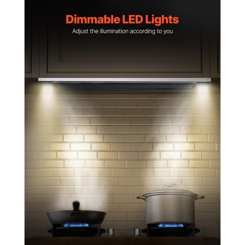 - Premium Stainless Steel: Crafted for durability and ease of maintenance, the vent hood features stainless steel. Its 2 detachable filters effectively capture grease and oil, and are dishwasher safe, making cleanup a breeze.