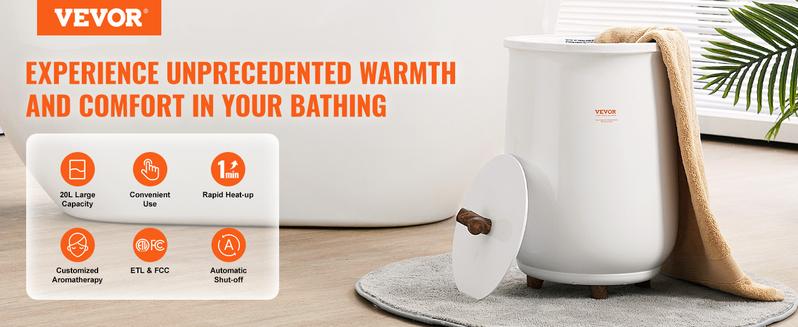 VEVOR Towel Warmer Bucket, 20L Large Towel Warmer for Bathroom, Auto Shut Off Towel Heater with 4-Level Timer Fits up to Two 40"x70" Oversized Towels, Bathrobes, Blankets, ETL & FCC Certified - capacity: 35L
