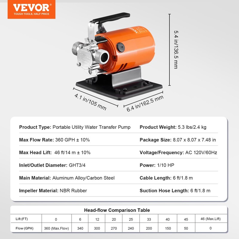 - Revolutionary Water Transfer: Are you ready for quality water control? Experience unbeatable efficiency with our 1/10 HP water transfer pump, delivering up to 360 gallons per hour and a 46 ft pumping height. Elevate your water transfer game!