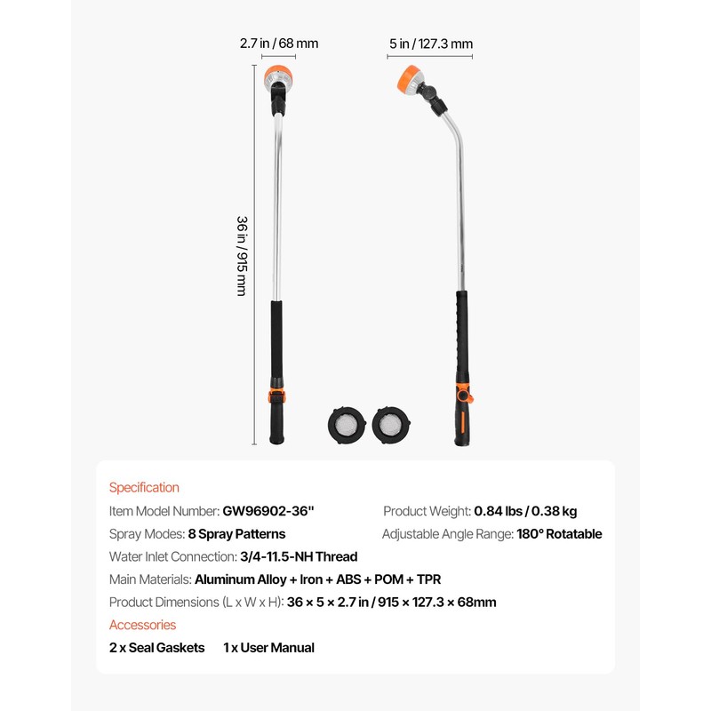 VEVOR Watering Wand, 36-Inch Extra Long Heavy Duty Garden Hose Wand with 8 Spray Patterns & 180° Swivel Head, Long Hose Nozzle Sprayer with on/off Thumb Control, Ideal for Hanging Baskets | VEVOR