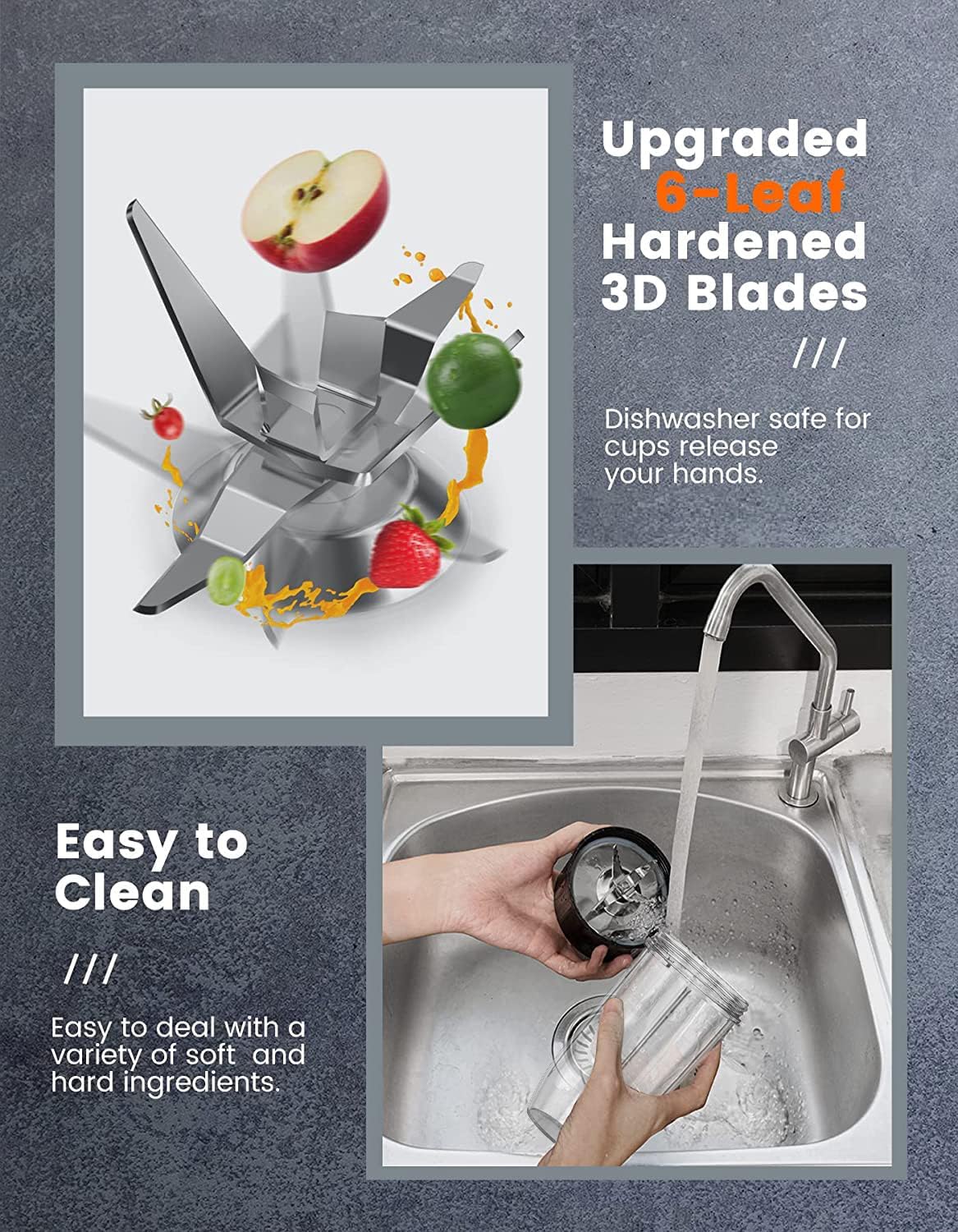 - Easy to Clean Smoothie Blender: Fill with 3/4 clear water, and a few liquid dish soaps, shake the personal blender cup, and press down for cleaning. The blade is partially removable and can be cleaned by just rinsing with tap water. The blender for shakes and smoothies cups and to-go lids is dishwasher safe (below 158℉).