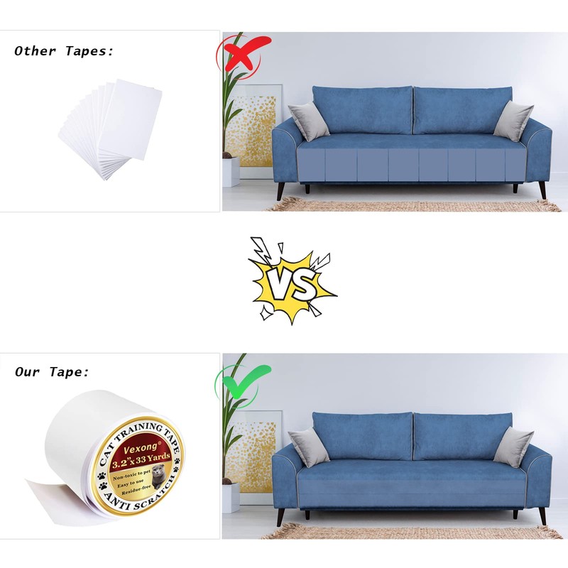- 【Latest Material】As a product of cat anti scratch for furniture, Vexong's cat deterrent tape is made of the latest material. This couch cat scratch protector is clear, wear-resistant, and smoother. This anti cat scratch furniture protector is more invisible. The cat tape for furniture can provide better protection as couch protector and couch corner protectors for cats. It works better than the double sticky paws tape for cats. (Note: We do not recommend use this tape to leather or faux leather.