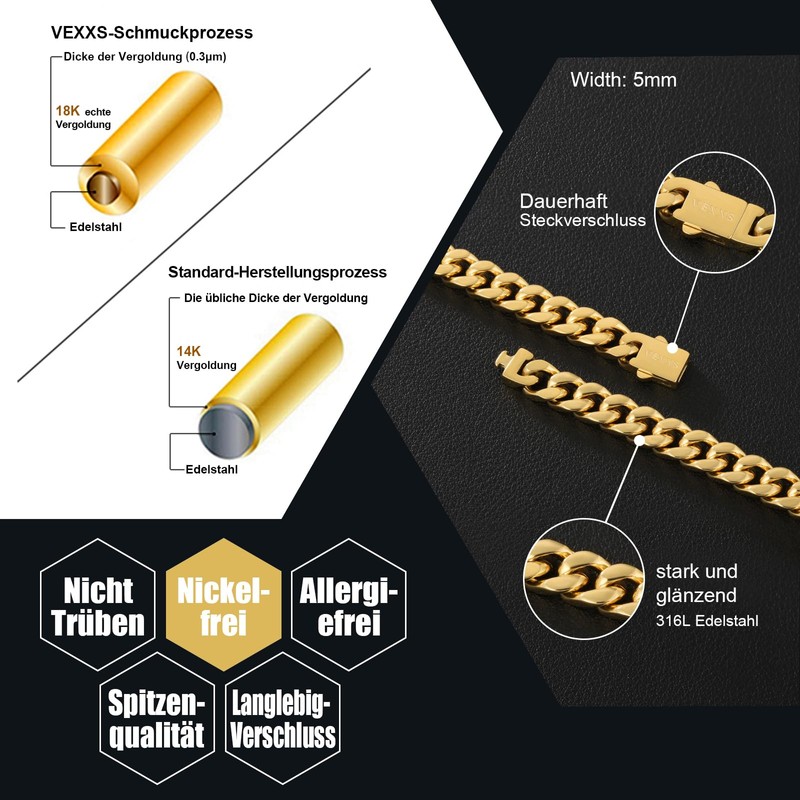 VEXXS Gold Chain Men's 5/7 mm, Cuban Link Chain Made of 18 K Gold/White Gold Plated Stainless Steel Curb Chain for Men Men Jewellery Gift 46-66 cm, Gold