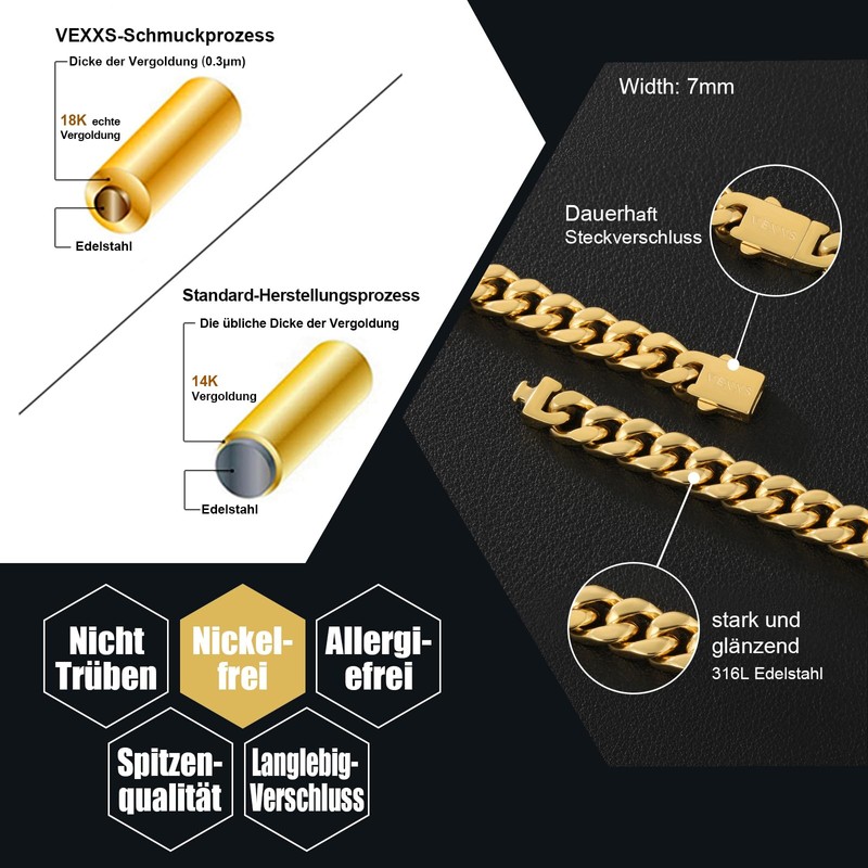 VEXXS Gold Chain Men's 5/7 mm, Cuban Link Chain Made of 18 K Gold/White Gold Plated Stainless Steel Curb Chain for Men Men Jewellery Gift 46-66 cm, Gold