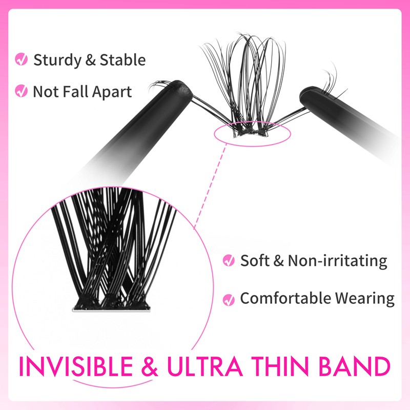 - Easy eyelash extension: apply eyelash glue to your natural eyelashes, then use a eyelash applicator tool to apply eyelash clusters under your natural eyelashes, and finally fix them with an eyelash sealer