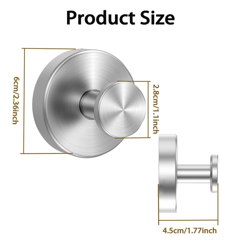 Transform your bathroom or living space with these sleek, modern round wall hooks. Crafted from premium brushed stainless steel, these heavy-duty adhesive hooks combine sophisticated style with practical functionality. The minimalist circular design features a beautiful brushed finish that complements any contemporary decor while resisting fingerprints and water spots. Each hook in this 2-pack set installs easily with strong adhesive backing - no drilling required - making them perfect for renters or those wanting to avoid wall damage. The robust construction ensures reliable performance for hanging towels, robes, bags, or other daily essentials. The generous round backplate provides stable support, while the protruding hook offers convenient access. These versatile hooks work beautifully in bathrooms, bedrooms, entryways, or any space where you need stylish, accessible storage. The timeless silver finish maintains its elegant appearance with minimal maintenance, making these hooks both a practical and aesthetically pleasing addition to your home.