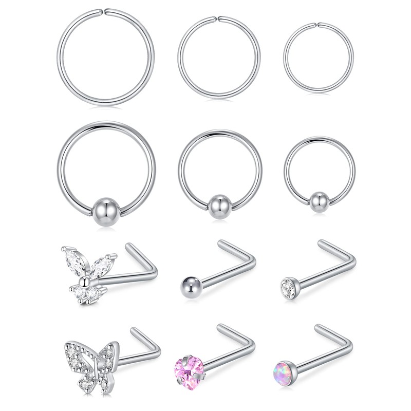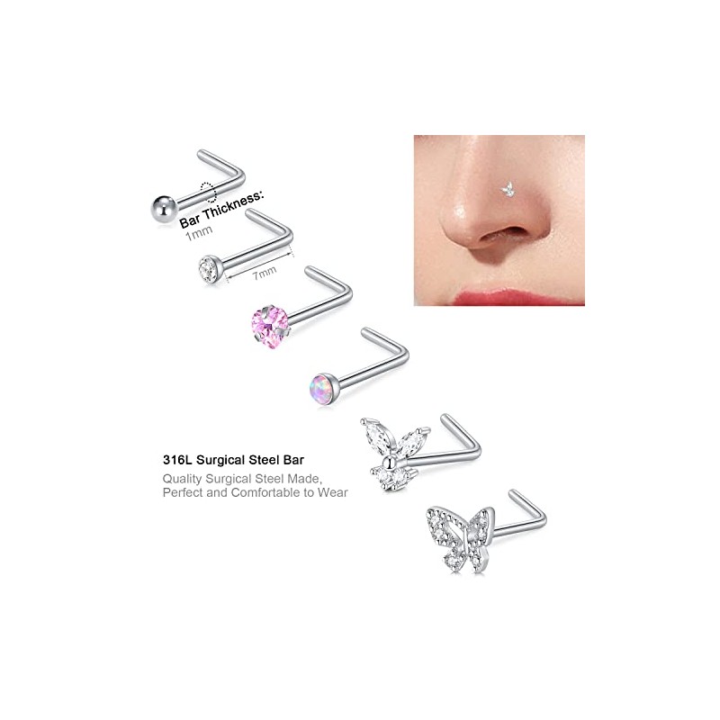 • Nose ring style: you can get 12 pieces 18 g 316L stainless steel nose rings, including 6 pieces L-shaped nose studs, 6 pieces hoop nose ring
