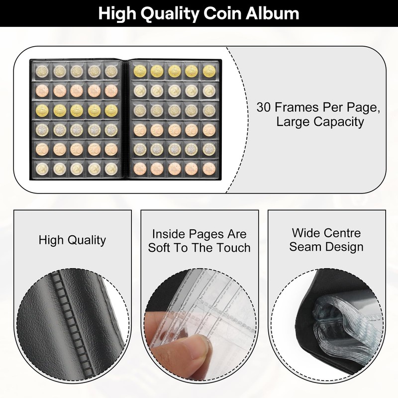 • Coin Album You will get a black coin album, which can easily store 480 coins, the size of the album is 8.5 " x 6.7 ", and the weight is 330g. The cover of the album is made of imitation leather material that is as hard as the cover of the album.