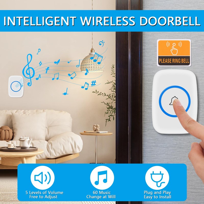 - 60 Ringtones & 5 Volume Levels This wireless doorbell features 60 melodic ringtones that can be switched at the touch of a button. Waterproof wireless doorbell outdoor with 5 levels of volume, adjustable from 0dB (mute) to 100dB, which can provide a loud and clear sound to meet your different needs.