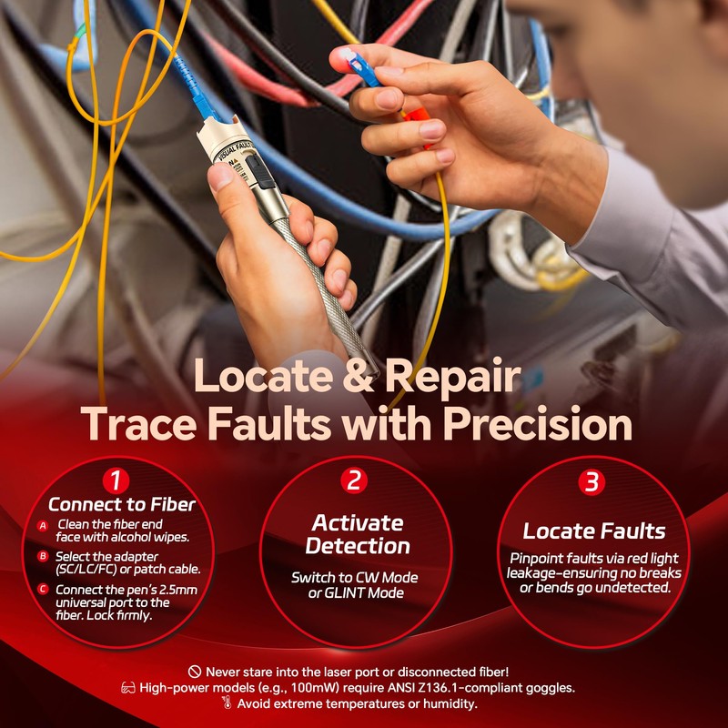 - 【Effortless Fiber Fault Detection】:Quickly and accurately identify fiber breaks,poor connections,bends,or cracks with a bright 650nm light that highlights any refraction caused by faults.